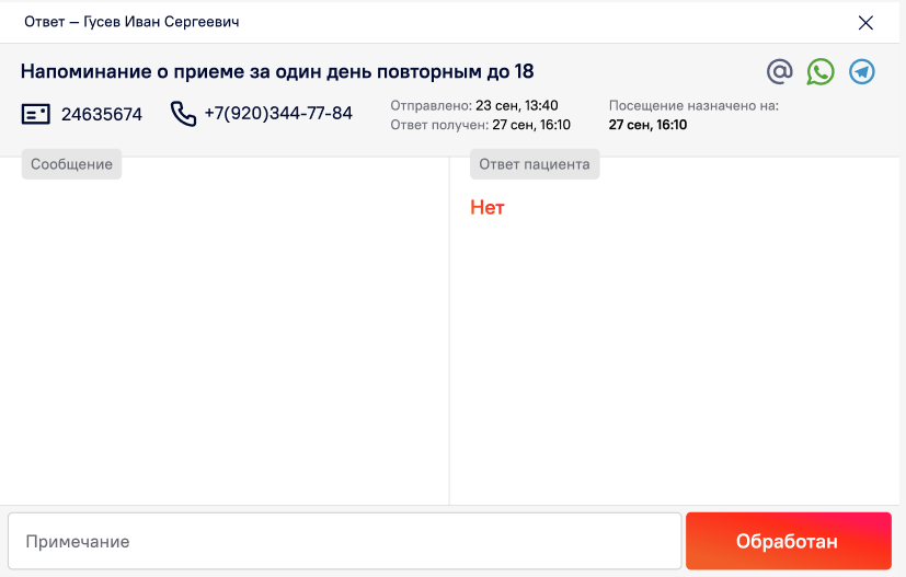 Поможем улучшить доходимость пациентов, отправив им напоминание о предстоящем приеме. Администраторы смогут просматривать ответы пациентов и своевременно вносить изменения в записи.